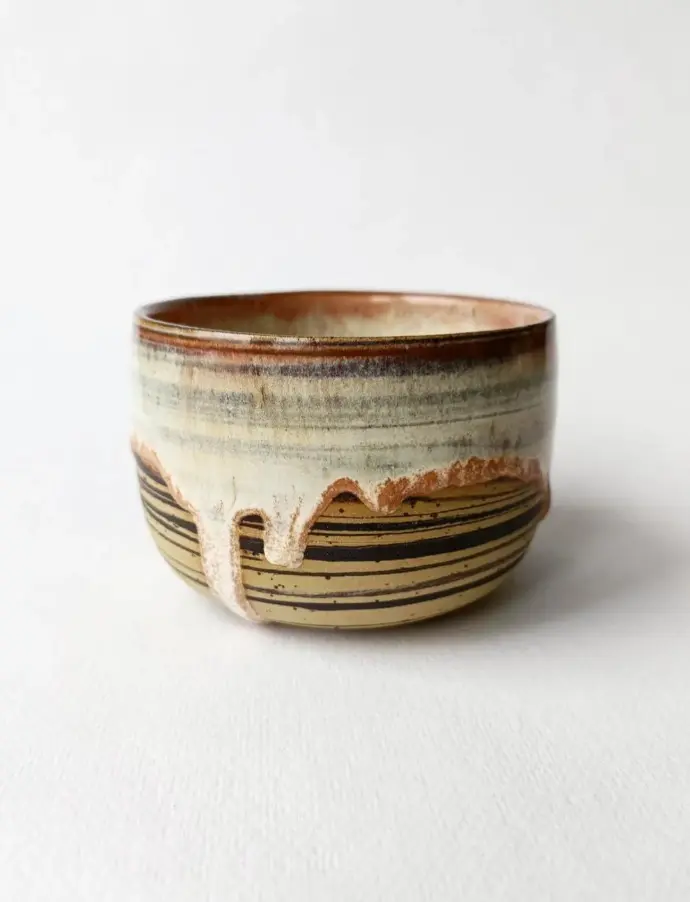 Fiecare piesă este unică și aduce un plus de autenticitate momentelor de pauză, însoțite de băutura preferată! Gresia crem și cea neagră se îmbină armonios, generând un efect marmorat sau un joc de dungi bine definite, care transpar sub glazura cu efect de curgere. Glazurate parțial pentru o experiență tactilă placută, cat și pentru a evidenția frumusețea materialului ceramic modelat. Contrastul dintre suprafețe, dintre mat și lucios, aspru și neted, ne invită să fim mai prezenți și ancorați în experiența utilizării.